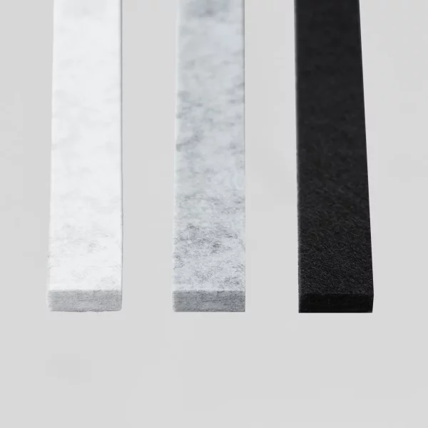 Bei Verwendung einer Abschlussleiste benötigen Sie eine Fugenleiste aus dem RecoSilent Filzmaterial. Die Fugenleiste hilft, die Abschlussleiste einfach auf der Schiefer-Endplatte zu montieren und einen schönen Abschluss an der Lamellenwand zu erhalten. Die Fugenleiste füllt bei Verwendung einer Abschlussleiste die plattenseitige Lücke und schließt mit einer Holzlatte ab.